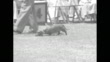 Title: "Nation's Greatest Dog Show" superimposed over owners walking dogs by judges and others watching / WS people and dogs cover ground between pavilions / people lead dogs by spectators seated and standing / dogs on blocks in center with others around / roped off area for judging maybe setters, two other sections in bg / CU judge inspecting dachshund / MS spectators / dachshund being led on ground / woman brushing French poodle / owners with poodles / CU poodles / former New York City Mayor Walker and wife Betty Compton / CU Walker and Compton / man leads best in show English Setter Sturdy Max / MS people watching / Pomeranian beside woman's dress / various shots men leading poodle, then Wolfhound, then Scottish terrier, then doberman pinscher / man beside winner Sturdy Max, woman holding trophy, others in bg; man holding smaller trophy hands man blue ribbon / CU Sturdy Max