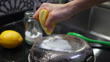 A close-up view of a person squeezing lemon over a greasy pan with baking soda, scrubbing a greasy pan using a green cleaning brush, showing a natural cleaning method in the kitchen using household ingredients.