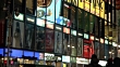 Neon signs reflect in the windows of MTV Studios in Times Square in New York City. - HD stock video