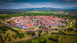 Aerial view of Neuf-Brisach, a UNESCO World Heritage Site and fortified town , located in Alsace, France. The image shows the distinctive octagonal layout of the fortifications surrounded by lush green countryside under a clear blue sky. Neuf-Brisach (Neubreisach) in the department of Haut-Rhin in the region of Alsace in France. Camera is tracking forward. Camera flies forward.