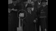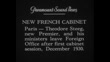Title card: "New French cabinet, Paris - Theodore Steeg, new Premier, and his ministers leave Foreign Office after first cabinet session, December 1930" / Steeg and his ministers coming out of building and standing on steps for photos / closer shot of Steeg speaking to assembled photographers / Note: exact day not known