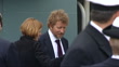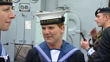 Literature: new James Bond book launch on board HMS Exeter; ENGLAND: London: HMS Exeter:EXTNaval personnel gathered for launch of new James Bond book 'Devil May Care'Guests and press gathered on deck of ship Soldier with machine gun Back View Author, Sebastian Faulks, chatting to guests as he turns and ZOOM INMen dressed in protective clothing and tin helmets PULL OUT to crew on deck HMS Exeter dockedGangplankNaval officers and crew on deck Military officers arrivingCaptain whistled aboard