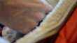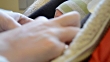 An adult adjusts the straps on a newborn baby's car seat.