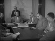 1952: ELKHORN CITY COUNCIL: MCU Newspaper 'Common Council.' MS 'Municipal Building.' INT VS Meeting in session, mayor Chas. E. Wilson, Edgar Lawrence, Lyman Arnold, Joseph Biagi, Howard Keegan, Delmore Gray, Dan Lawrence, Ed Lock & DeMarr Ross. WI