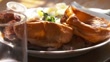 US newspaper upsets Yorkshire folk by suggesting serving Yorkshire Pudding as a dessert; ENGLAND: Yorkshire: York:INTYorkshire puddings on a plate as part of a roast dinnerRoast dinner being eatenReporter sat with Jason Hartley (Chef and food campaigner)Jason Hartley (Chef and food campaigner) interview SOTMeta and vegetables inside a large Yorkshire pudding that is then rolled upGravy ladled into Yorkshire puddingsRoast dinner with Yorkshire puddings on plateVox pops SOTYorkshire pudding being eaten as part of a roast beef dinnerMan eatingFrench toast being cooked