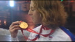 NIGHTCooke wearing gold medal around neckClose up gold Olympic medal and Nicole Cooke (British cyclist, Olympic gold medal winner) speaking to press SOTENDS