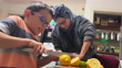 A Nine Year-Old Boy Uses a Large Kitchen Knife to Cut a Lemon in Half on a Cutting Board while His Mother Helps Him Make Lemonade