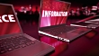 red tinted notebooks displaying technological words on a city background.