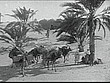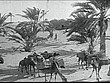 1925 B/W MONTAGE Oasis in Sahara desert, camels loaded w/ packs mill around between palm trees. Two young camels play while Berber Bedouin stands by / Nefta, Tunisia - stock video