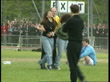 LS Liam running away from fans, minders grab fans and take them back to crowd. VS football match. Blur 2-0 Oasis.