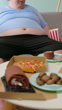 obese man sitting in the living room watching TV while eating junk food popcorn chips cake pizza high sugar high fat fried food - couch potato