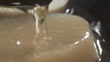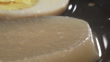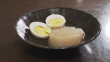 Oden with boiled egg and Daikon (Japanese radish), pouring broth over the oden. Oden is a Japanese Pot-au-feu like dish made by simmering various ingredients such as boiled eggs, Daikon, various fish paste products and others, in a broth made from bonito flakes and kelp, seasoned with soy sauce and other seasonings.