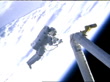 VS of astronaut Mark Lee outside on a spacewalk mission, testing a new backpack called Simplified Aid for EVA Rescue; untethered and using the backpack to test its maneuverability by moving along the position of the mechanical arm of the Space Shuttle Discovery.