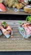 Close-up of sushi rolls with chopsticks, topped with teriyaki sauce and microgreens