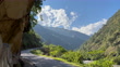 Wide shot of twisting mountain road highlighted by the rays of the sun under dramatic cloud filled sky.