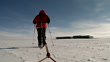 MS LA POV of man on skis pulling pack sleds across South Pole ice with US South Pole base in distance / South Pole, Antarctica - HD stock video