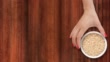 Top view of woman hand sliding white bowl full of brown rice over wooden background. Three options available for positioning the bowl: left, middle and right