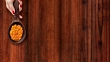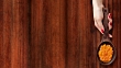Top view of woman hand sliding wooden spoon full of carrot puree over wooden background. Three options available for positioning the spoon: left, middle and right