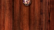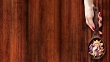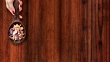 Top view of woman hand sliding wooden spoon full of coleslaw salad over wooden background. Three options available for positioning the spoon: left, middle and right