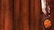 Top view of woman hand sliding wooden spoon full of grated carrot over wooden background. Three options available for positioning the spoon: left, middle and right