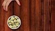 Top view of woman hand sliding white bowl full of green gnocchi over wooden background. Three options available for positioning the bowl: left, middle and right