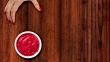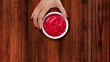 Top view of woman hand sliding white bowl full of raspberry ice cream over wooden background. Three options available for positioning the bowl: left, middle and right