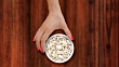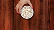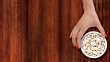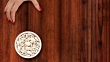 Top view of woman hand sliding white bowl full of a mix of white beans over wooden background. Three options available for positioning the bowl: left, middle and right