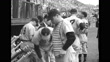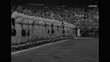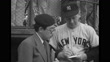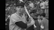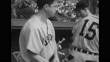 WS Officials and US All-Star baseball players and Yomiuri Giants players on field, flashes from press cameras, crowd in stands in bg / WS players stand for anthems / MS US players standing for anthem / WS US and Japanese flags flying on poles / WS Giants players standing for anthem / MS US player Ed Lopat signing autograph, pen does not work, Japanese man gives his pen to Lopat / MS US players choose bats and equipment from rack / CU Lopat / VS US and Giants player shaking hands for photo / MS a bespectacled Dom DiMaggio of the Boston Red Sox
