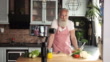 at the table, an elderly chef blogger teaches how to put on a mask and teaches how to cook salad. one person. kitchen interier. quarantine.