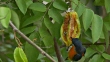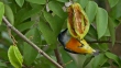 Olive-backed sunbird or Cinnyris jugularis eating star apple fruit
