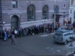 Olof Palme assassination: Flowers & vigil; a)SWEDEN: Stockholm:EXTMS People standing silently behind barrier PULL OUT massflowers on ground where Palme shotCMS Crying woman covers face with handMS People standing behind barriersMS Policeman carrying bunch flowers towardsMS People standing behind barriersMS Policeman places flowers on groundTCMS B/W photo Palme on ground PULL OUT flowers, incense burners alight amongst themTS Queue outside cabinet building PAN R-L as queue stretches round corner of "Peace Street", people waiting to sign book of condolenceINTTCMS Two women walk L-R carrying rosesBV Two men signing book of condolences in front of photograph of PalmeTMS People signing, flowers in f/gCMS VOX POPS (3 men, 1 woman) EXT SOF"I feel angry -- left us"