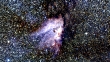 Omega Nebula. Coloured infrared image of the Omega Nebula, also known as Messier 17 and NGC 6618. This is a star forming region, characterised by the glow of ionised hydrogen gas which is excited by hot young stars in the centre. The dense star background is in part of the Milky Way, with some stars obscured by long, winding dust clouds. This image was made as part of the Two- Micron All-Sky Survey (2MASS) project.