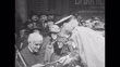On the streets of Broadway, a crowd of people buy war bonds from a salesgirl known as "The Little Colonel". Famous theater producer David Belasco buys a war bond from her, New York City, New York, U.S.A., 1917.