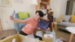 happy asian couple unpack parcel from online shopping delivery service holding new bag and use phone take picture in living room at home