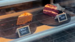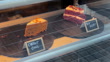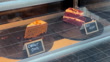 High angle close-up shot of only one slice left of carrot and red velvet cakes at bakery store window