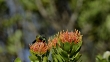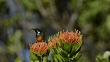 Male orange-breasted sunbird (Anthobaphes violacea) feeding on the nectar of a pincushion flower (Leucospermum cordifolium) during the mating season. This bird is endemic to the Cape area of South Africa. It reaches lengths of 17 centimetres and feeds on insects and nectar, using its long slender beak to probe flowers and the soil. It is an important pollinator of several local plant species. Photographed at Kirstenbosch National Botanical Garden, Cape Town, South Africa.