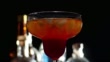 Swirling ice cubes in orange cocktail in margarita glass on the dark bar counter