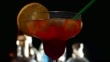 Orange cocktail in margarita glass on the dark bar counter. Adding a drinking straw