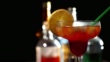 Orange cocktail in margarita glass on the dark bar counter. Dolly shot