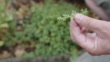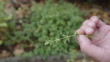 Oregano. Origanum vulgare. Pruned plant in herb garden. Human hand holding sprig. Wilted pot marigold in field of view. Mulched area. Herb garden.