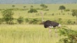 Ostrich walking running across luscious green savannah plains of Masai Mara North Conservancy, African flightless birds in Maasai Mara National Reserve, Kenya, Africa Safari Animals