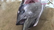 ZI on the head of a landed pacific bluefin tuna, binominal name Thunnus orientalis, at fish market