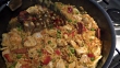 Paella with rice, seafood: shrimps and mussels cooking at home. - 4K stock video
