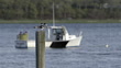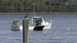 A pair of shore birds sit on a pier with lobster fishing boat out of focus in background - HD stock video