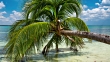 Coconut palm tree on beautiful tropical beach. Turquoise water and fluffy white cumulus clouds in the deep blue sky. Playa Larga in the bay of pigs, Cuba