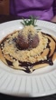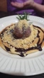 Pancake with chocolate fudge and cookie crumble and ice-cream chocolate.