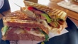 This clip features a panini sandwich at a cafe in San Jose, Costa Rica. The sandwich featured chicken, tomato, avocado, and melted cheese. A black ceramic plate and a wooden table are visible in the clip.