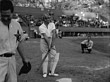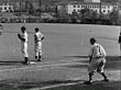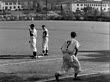 Panning baseball comedian MAX PATKIN - The Clown Prince of Baseball - wearing oversized baseball uniform with question mark on back, stalking sidelines and serving as first base coach at Gilmore Field in Hollywood, during Pacific Coast League baseball game pitting Hollywood Stars against Los Angeles Angels / Max Patkin clowns around / ERROL FLYNN posing with cricket bat and shin guards while standing behind home plate / two young women sitting in stands, laughing and smiling / unidentified older man wearing baseball uniform and cap while signing autographs for eager kids, fans leaning over railing. Celebrities at Pacific Coast League Baseball Game on January 01, 1946 in Los Angeles, California (Footage by Getty Images)