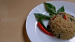 fried green curry rice on the white plate.