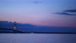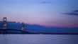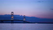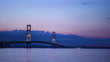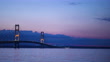 A real time panning video of Michigan's Mackinac Bridge during the early evening as the bridge lights come on. An iconic symbol and tourist destination the clip shows the movement of Lake Michigan and a colorful sunset sky.